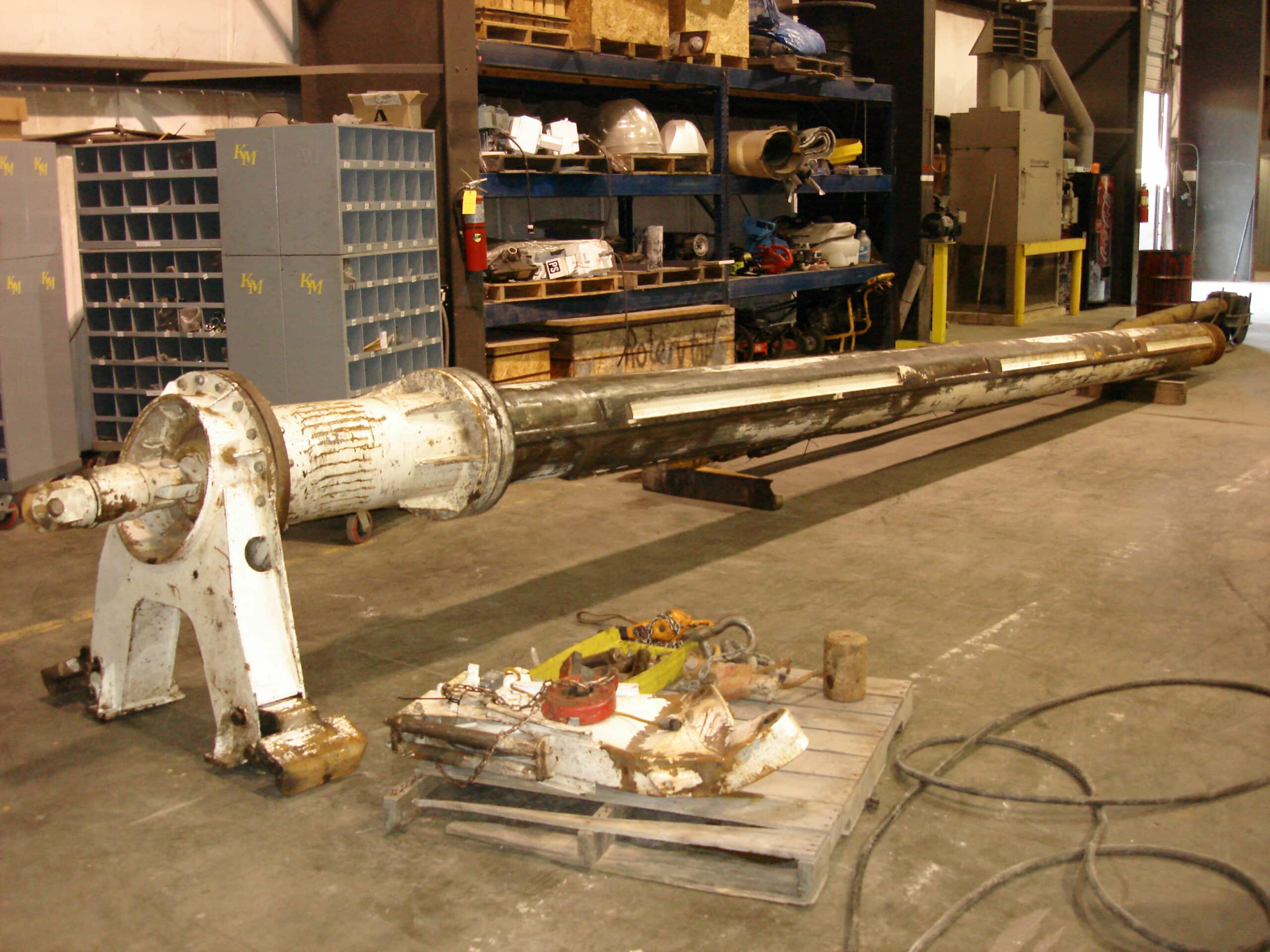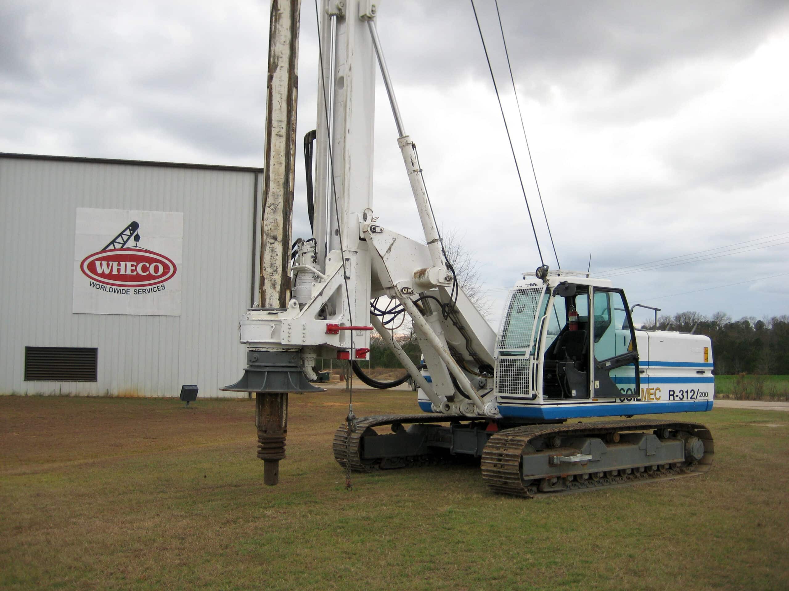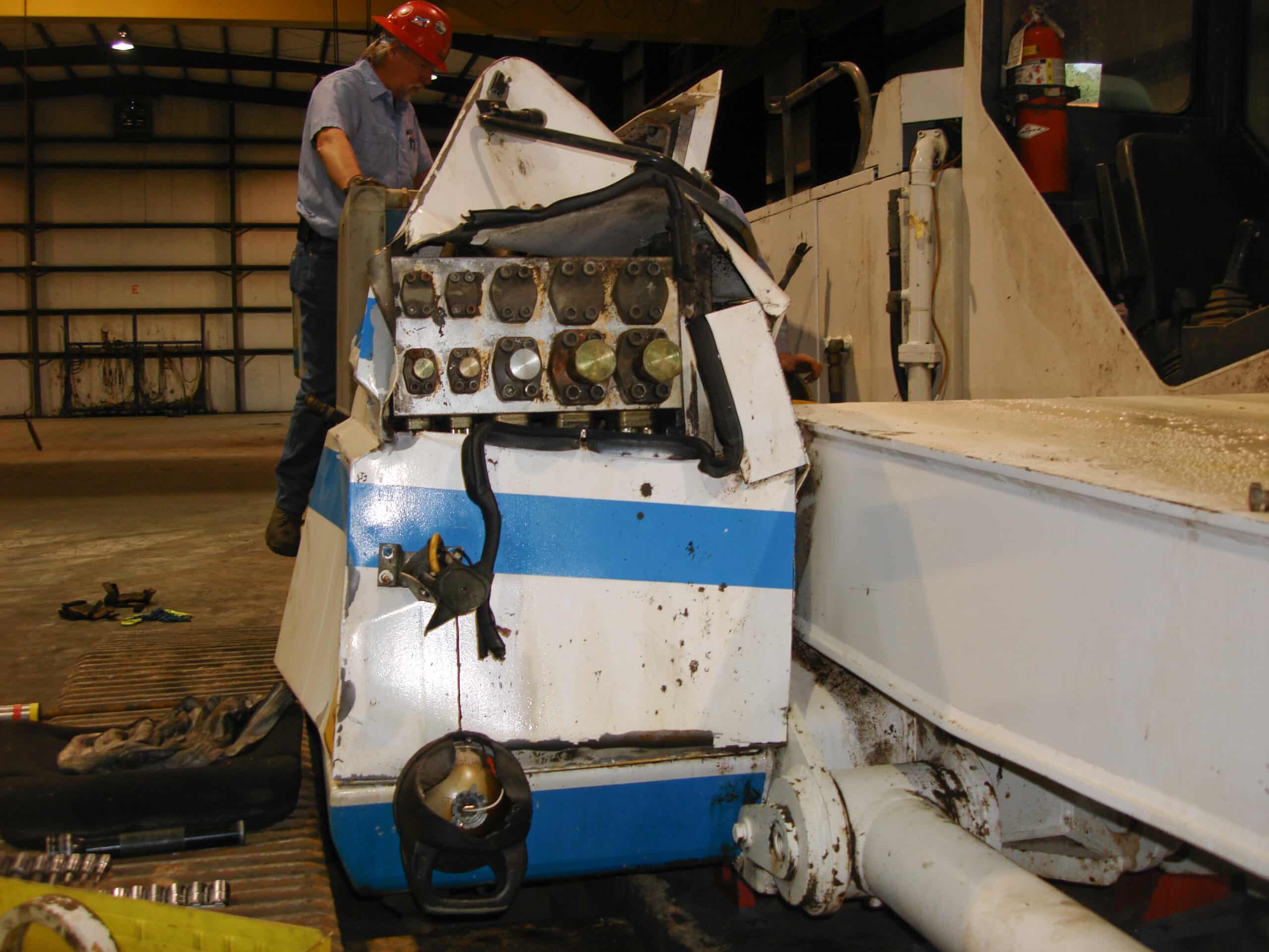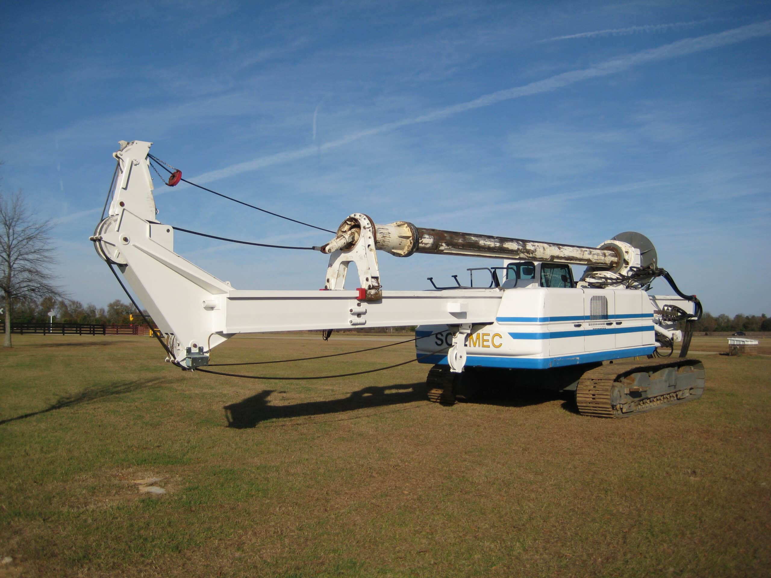 This Soilmec R-312 was damaged in a highway-related accident where it fell off a truck while in route to the job site. Significant damage occurred to the mast, kelly bar, engine, and upper mast assembly. There was also damage to other internal structural components, as well as extensive cosmetic sheet-metal damage. See below for pictures of the repair.